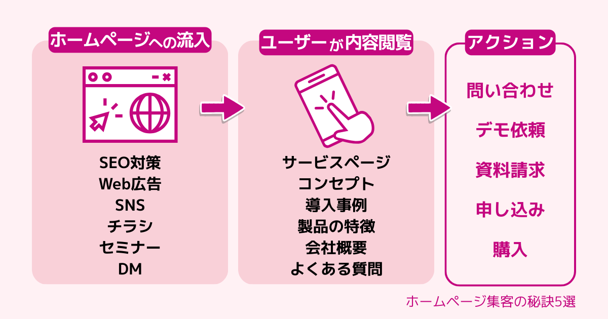 ターゲットユーザーをホームページにどう連れていくのか、集客チャネルを意識する必要があります。