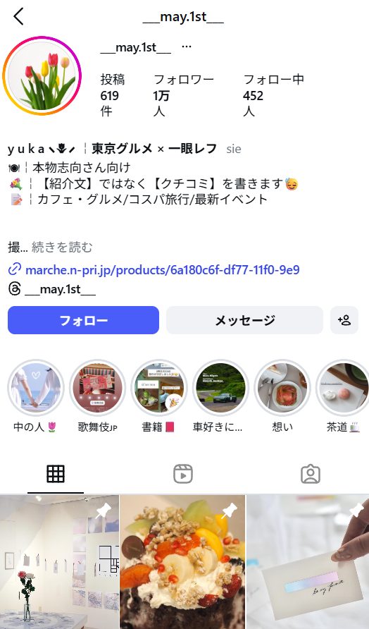 したがって、飲食店やカフェ、スイーツブランドなどのPR施策と相性が良いインスタグラマーです。店舗の魅力や料理のビジュアルを丁寧に伝えたい場合に起用したいアカウントの一つです。