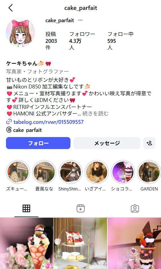 ケーキちゃん🍰🎀(cake_parfait)は、スイーツやカフェを中心に紹介しているインスタグラマーです。アカウント名の通りケーキやパフェなどのスイーツの投稿内容が多く、甘いものが好きなユーザーから支持を集めています。可愛らしいスイーツや季節限定メニューなどを紹介する投稿が多い点が特徴です。
