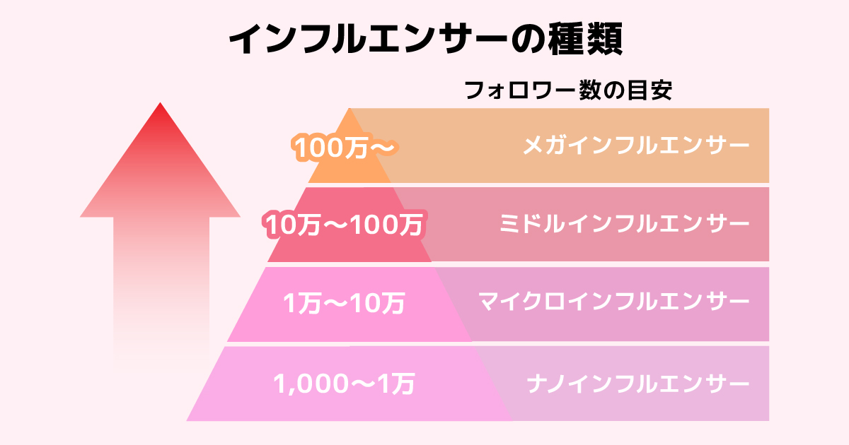 上図の通り、インスタグラマーやインフルエンサーはフォロワー数によっていくつかの種類に分類されます。