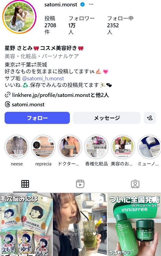 星野 さとみ🎀コスメ美容好き🎀(satomi.monst)さんは、コスメや美容の情報を中心に発信しているインスタグラマーです。スキンケアやメイクアイテムなどを紹介する投稿が多く、美容に関心のあるフォロワーから支持を集めています。コスメの使用感やおすすめポイントを紹介する内容が多い点が特徴です。