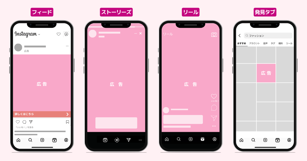 写真や動画が自然に並ぶ場所で表示されるため、広告特有の硬さが緩和されます。探す意識を持つユーザーが多いため、関心を向けられやすい点も特徴です。拡散的な訴求に適した領域となります。