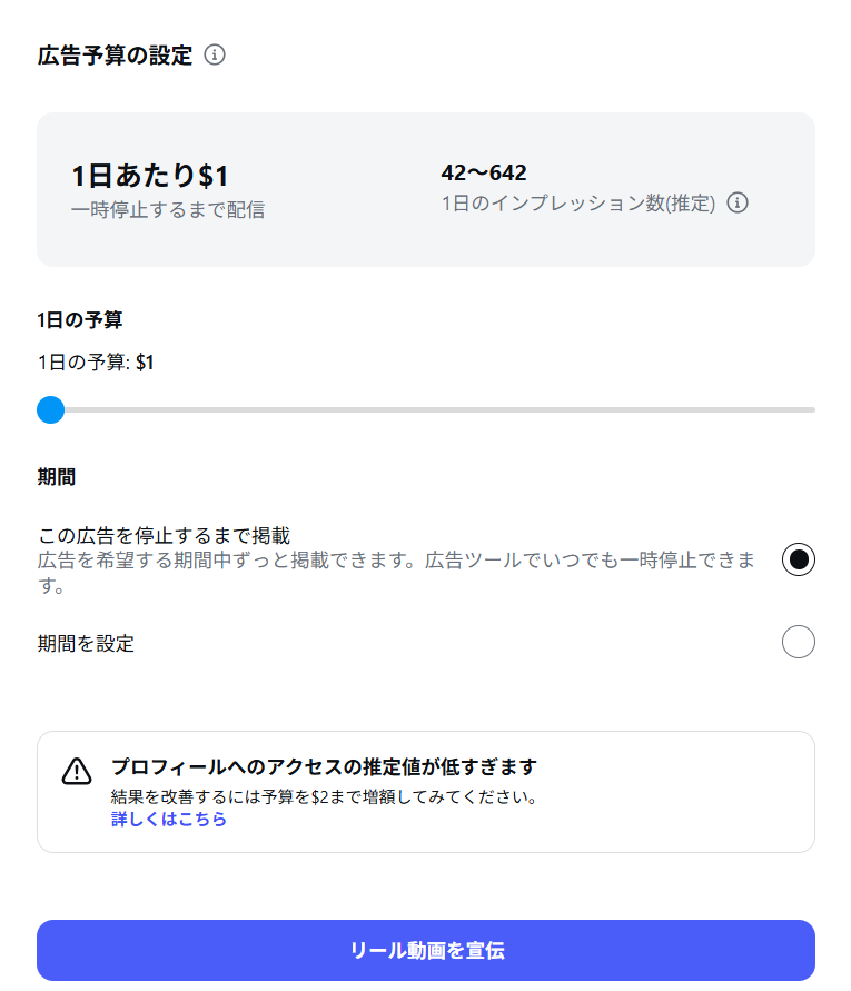 ただし、設定した予算以上のリーチや成果を得たい場合は、ある程度まとまった費用を見込む必要があります。